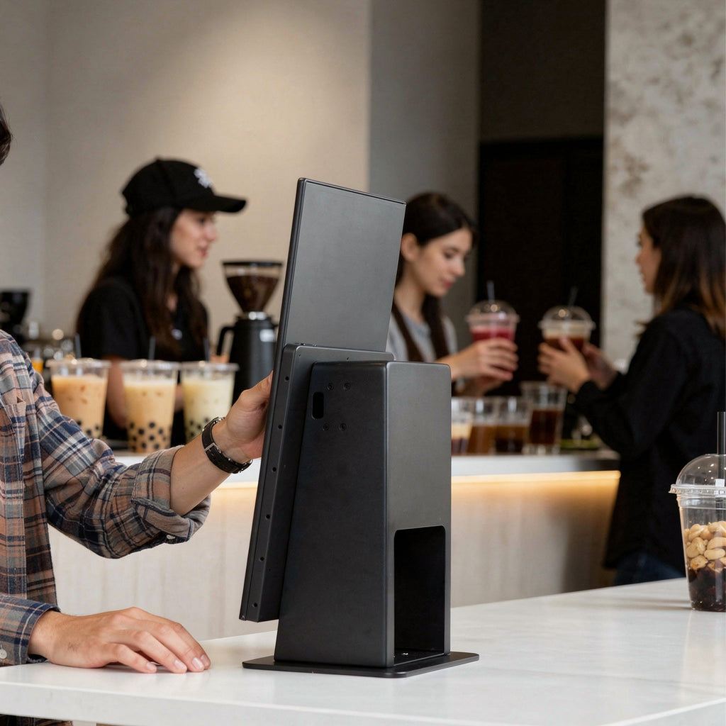 Elevate your customer experience with the KIOSK01 Countertop Stand. Compact yet durable, it positions the display at an ideal viewing angle for comfortable, intuitive interaction. Internal routing keeps cables neatly organised, with space to discreetly house a receipt printer - maintaining a clean, professional aesthetic at the counter.